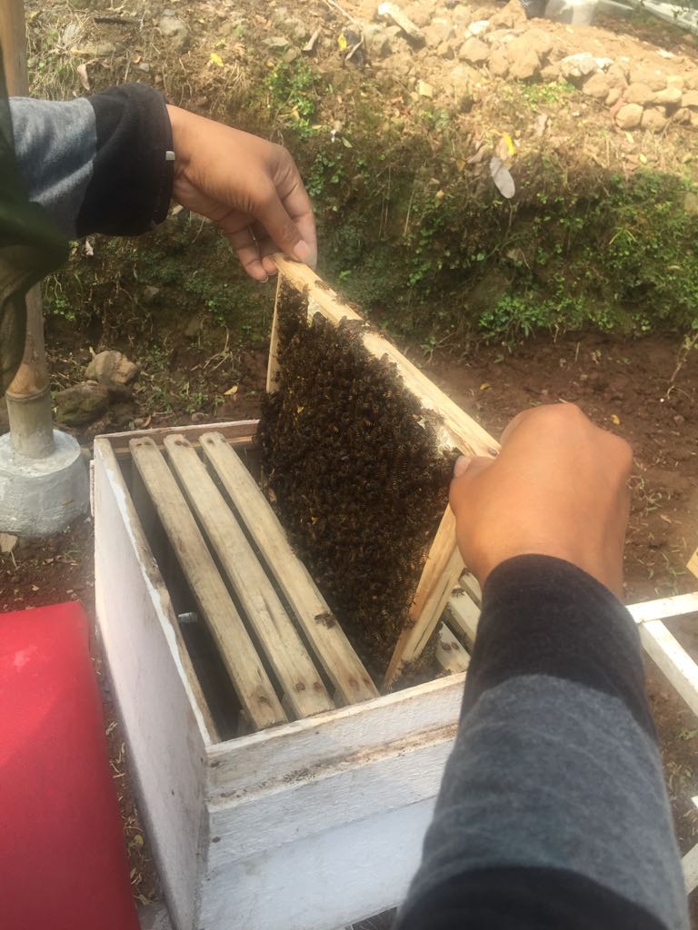 Demo panen madu Trigona sp. pada tanggal 24 Juni 2018 oleh bapak H. Dr Ir Mahani MSc. (bercelana hitam dan berkaos merah guava), pakar dan pebisnis lebah dari Urban Bee "Teuweul Bogor". Tampak dalam foto pengelola masjid An-Nahl, bapak D. H Wibowo (bercelana cokelat) dan ibu K.L Ginoga (berjilbab abu - abu).